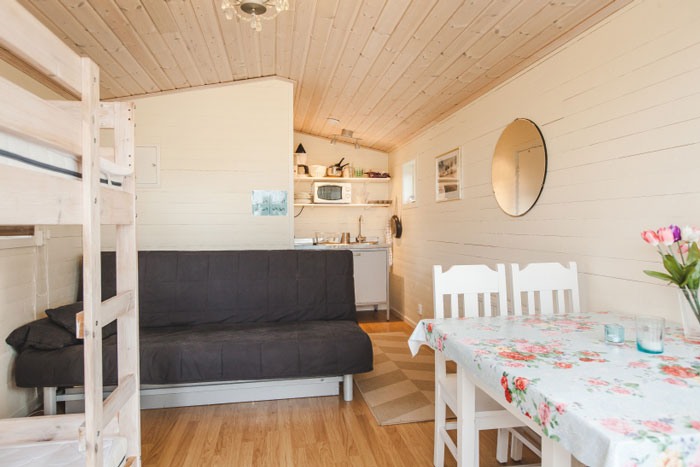 The cottages are of hostel standard and measure 20 square meters with four beds (bunk bed plus sofa bed), kitchenette with hotplate, refrigerator, microwave oven and utensils, toilet and shower and kitchen table with four seats. Cots are available to add to your booking. Parking directly outside, and there is one electric car charging point.